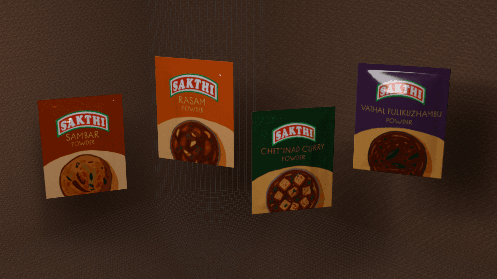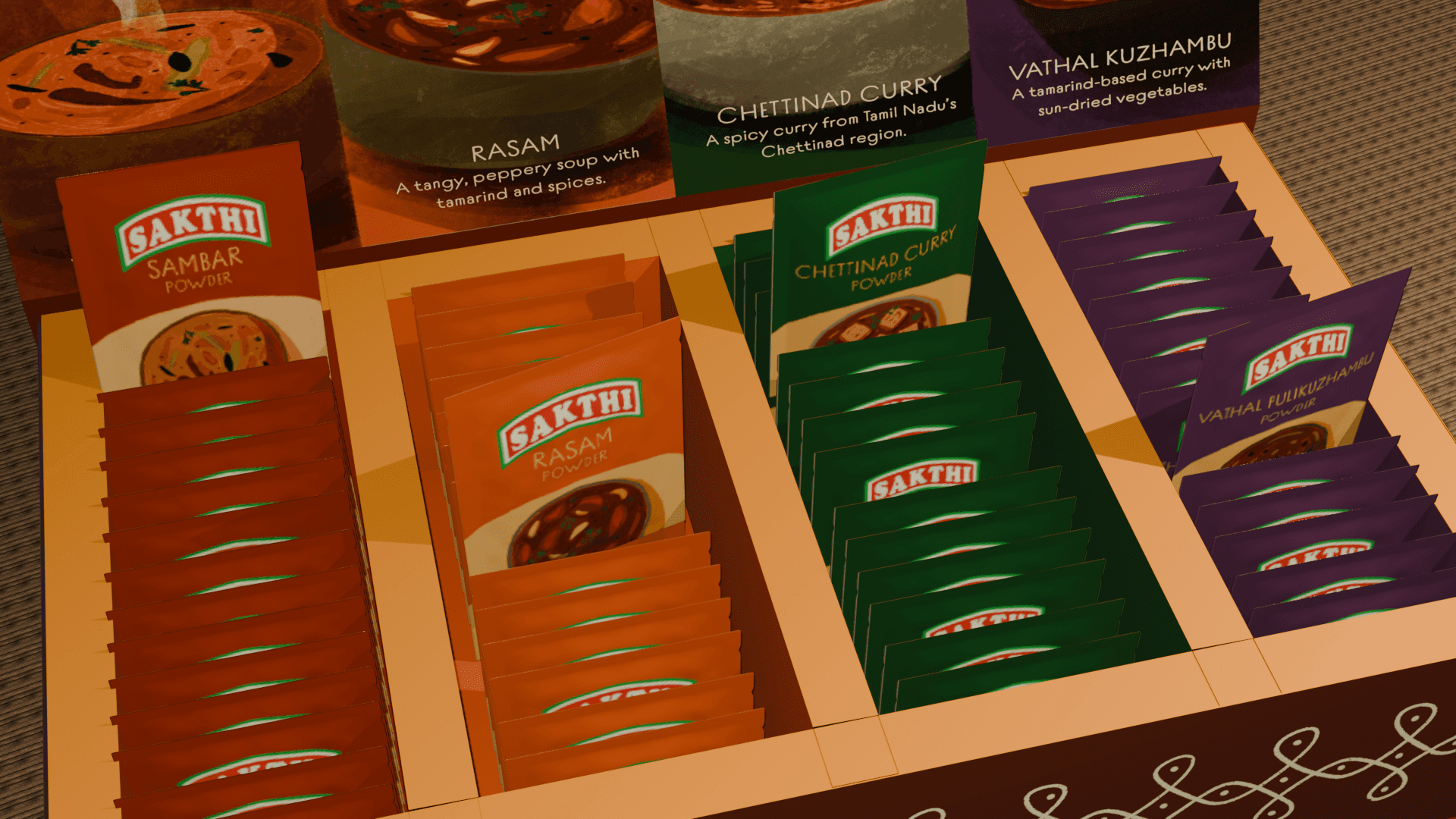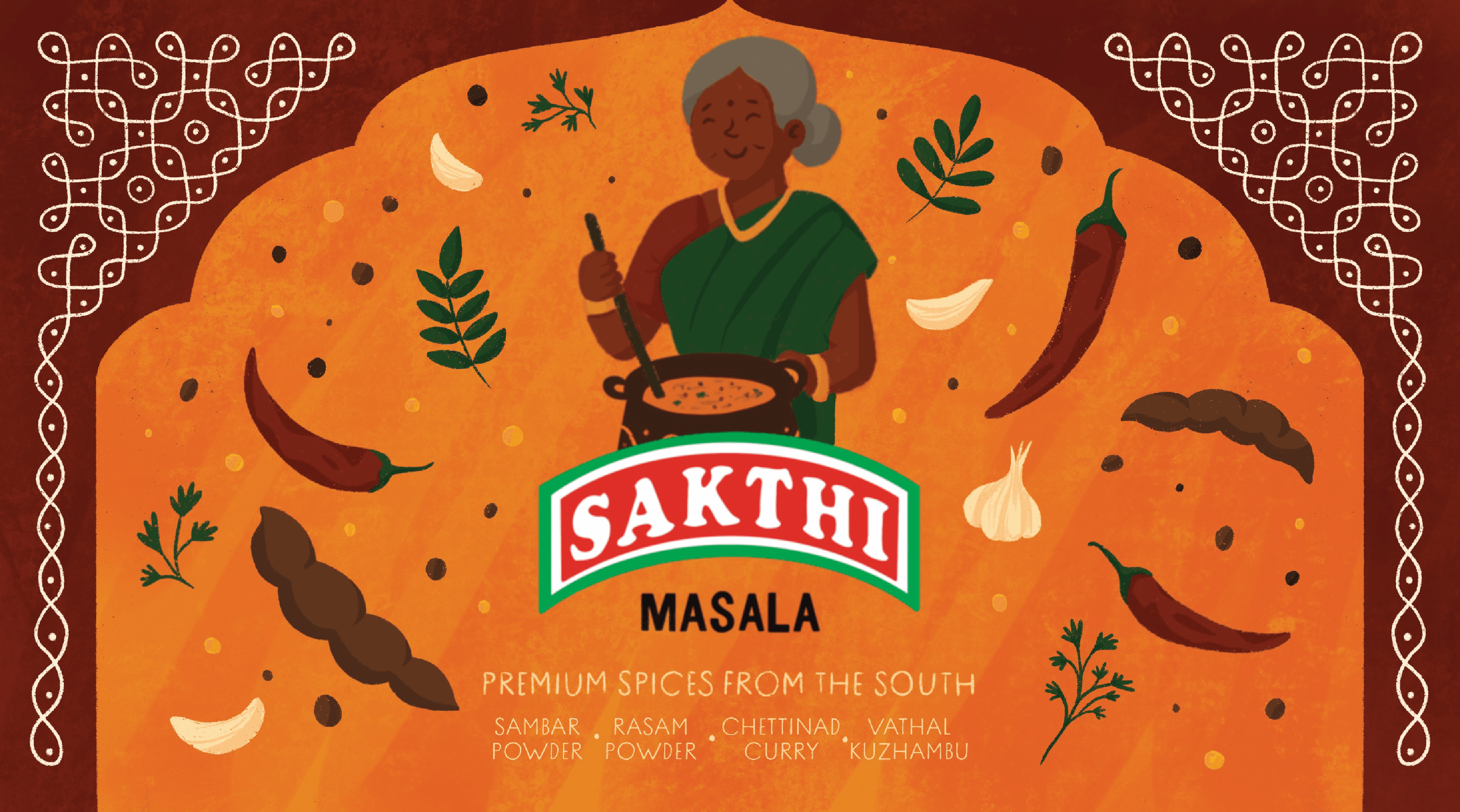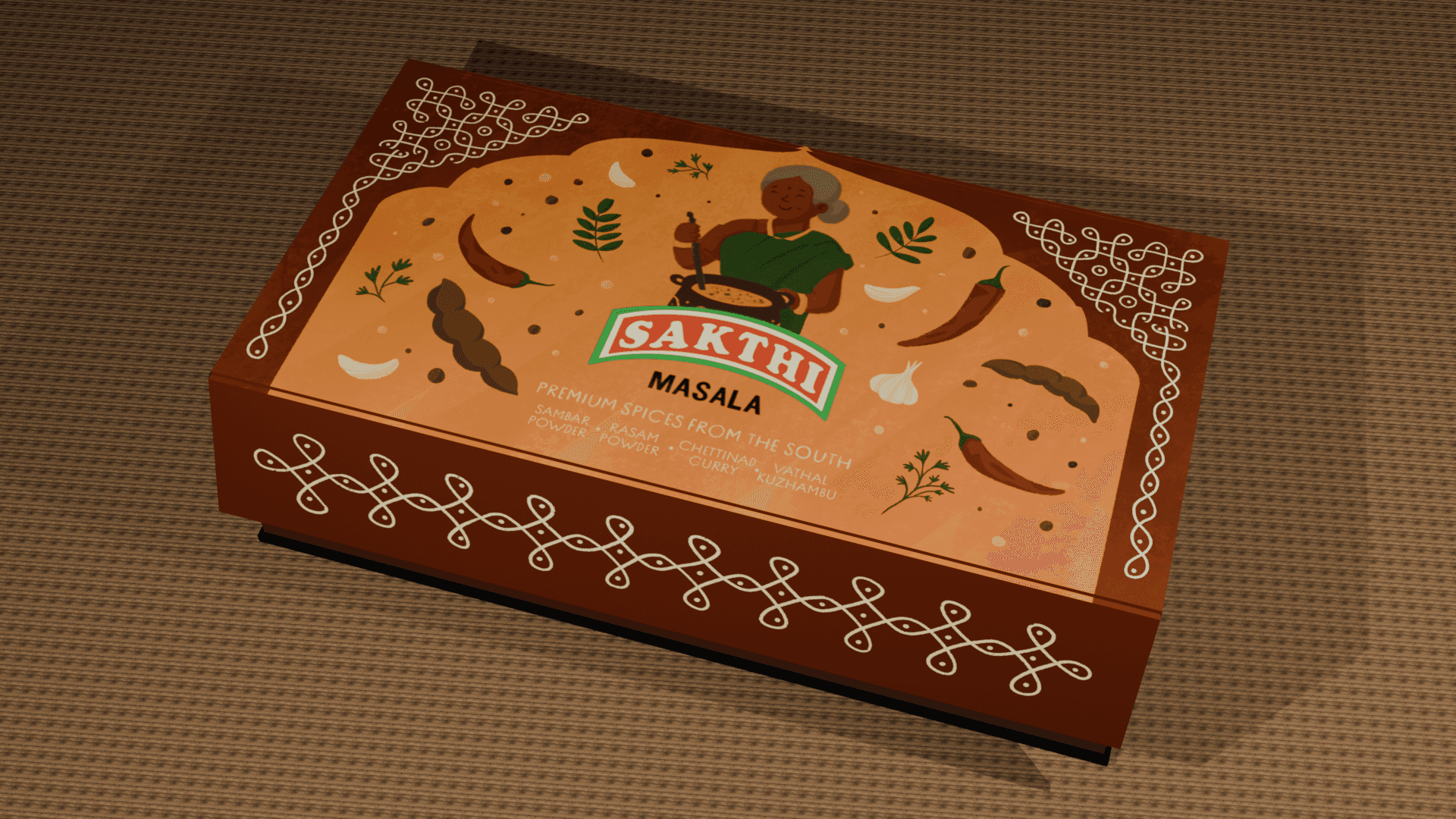 The Sakthi Masala packaging concept reimagines everyday spices through a balance of tradition and modern usability. Drawing from Tamil culinary culture and the familiarity of a home kitchen, the design simplifies visuals while retaining warmth and authenticity. Thoughtful structural choices keep spices fresh, and a cohesive color and type system brings clarity across the range.