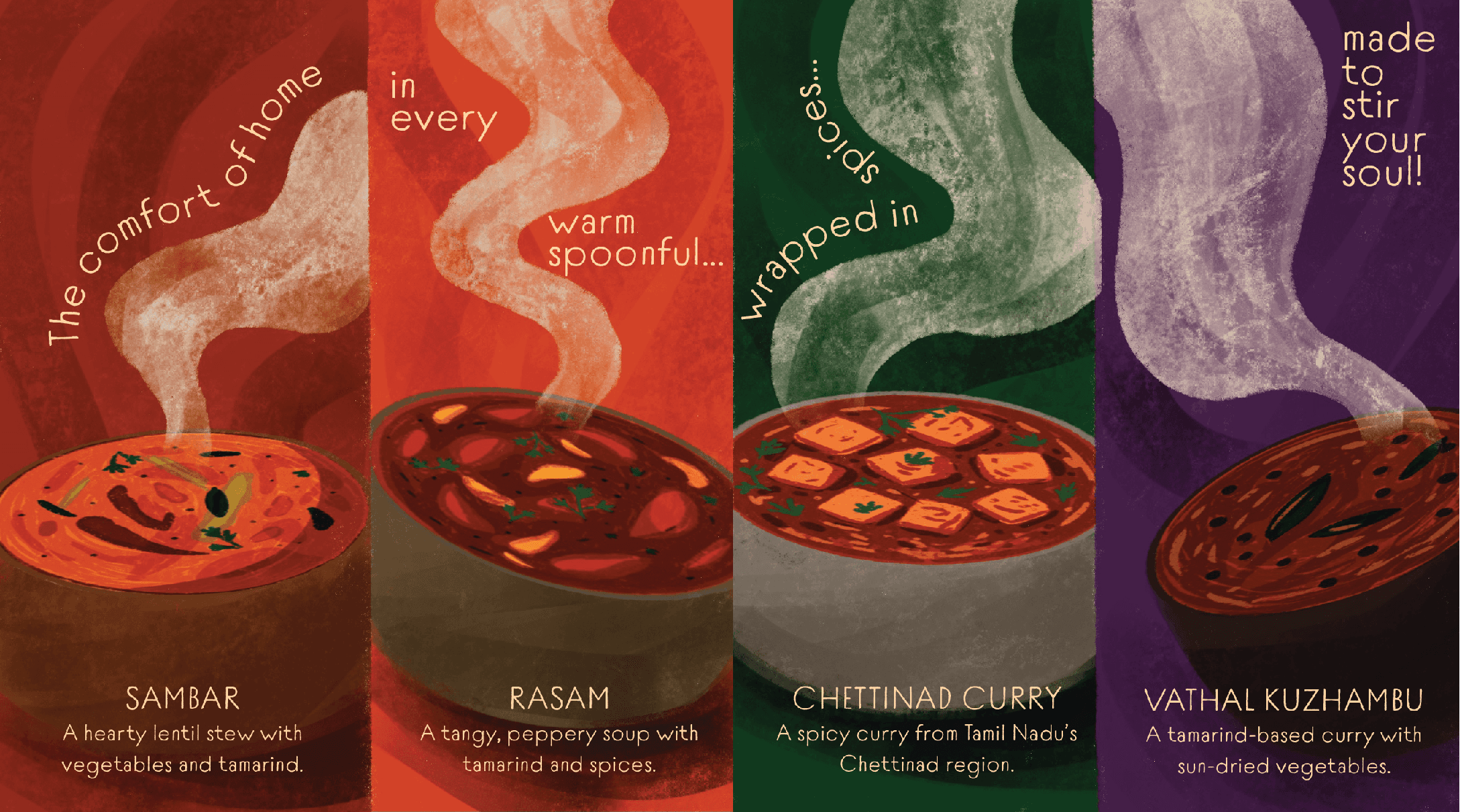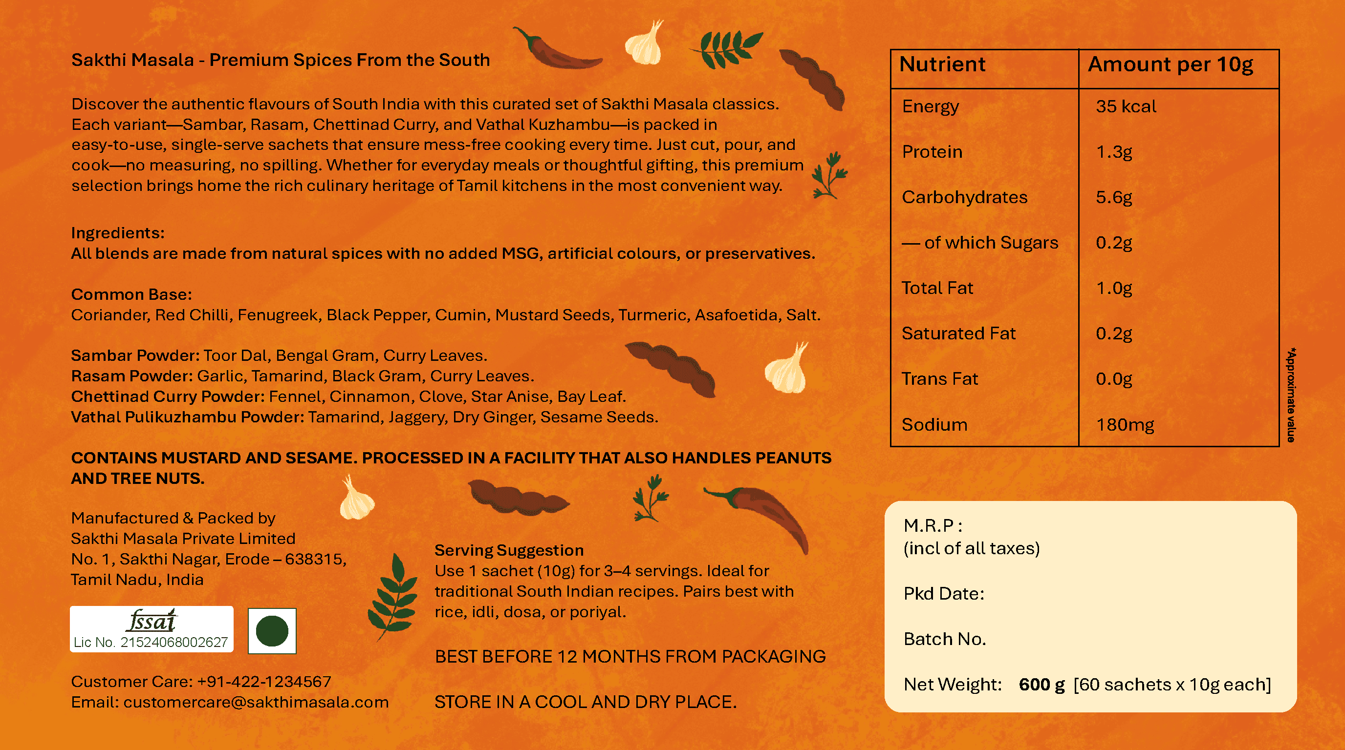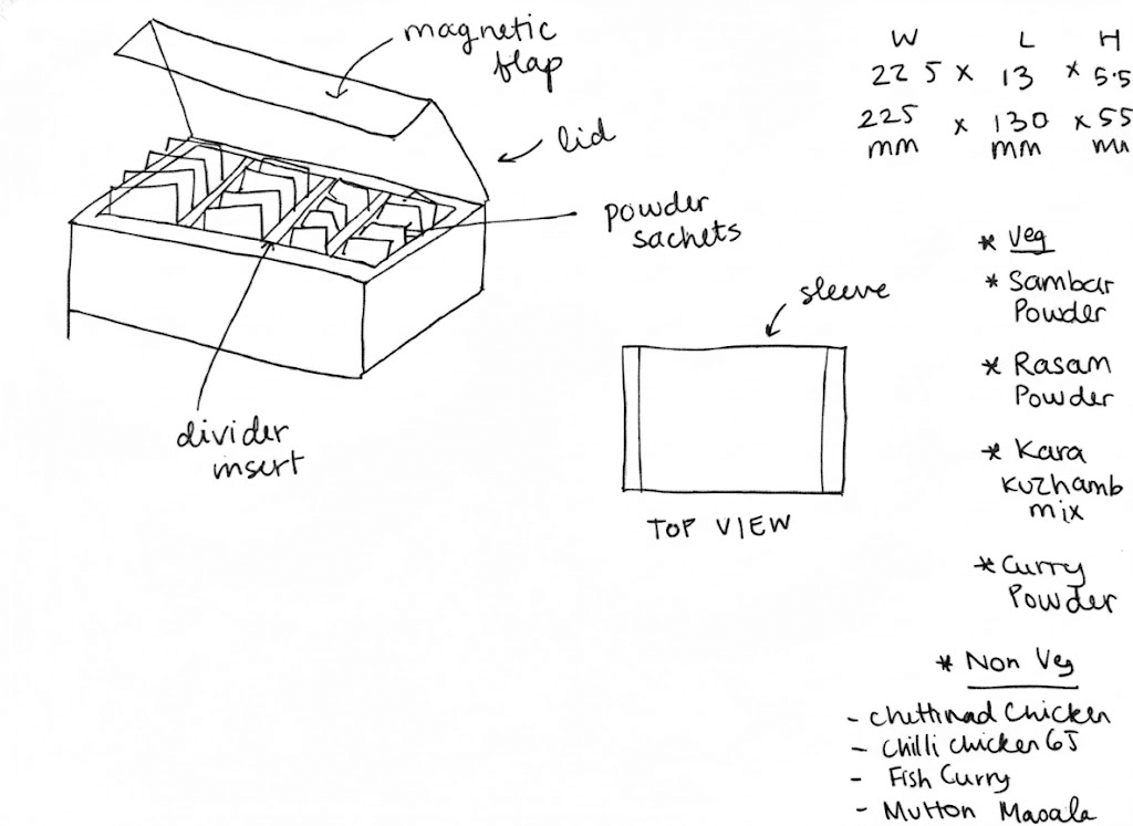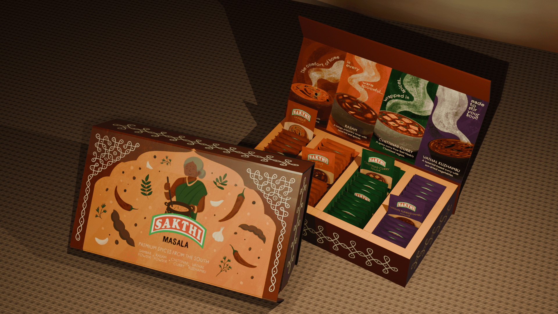 Inspired by the warmth of a South Indian kitchen, the Sakthi Masala packaging draws from the familiarity of a grandmother’s spice box. Illustrated storytelling, rich colours, and subtle Tamil motifs come together in an organised box format, with individually sealed sachets that keep the spices fresh and easy to use.