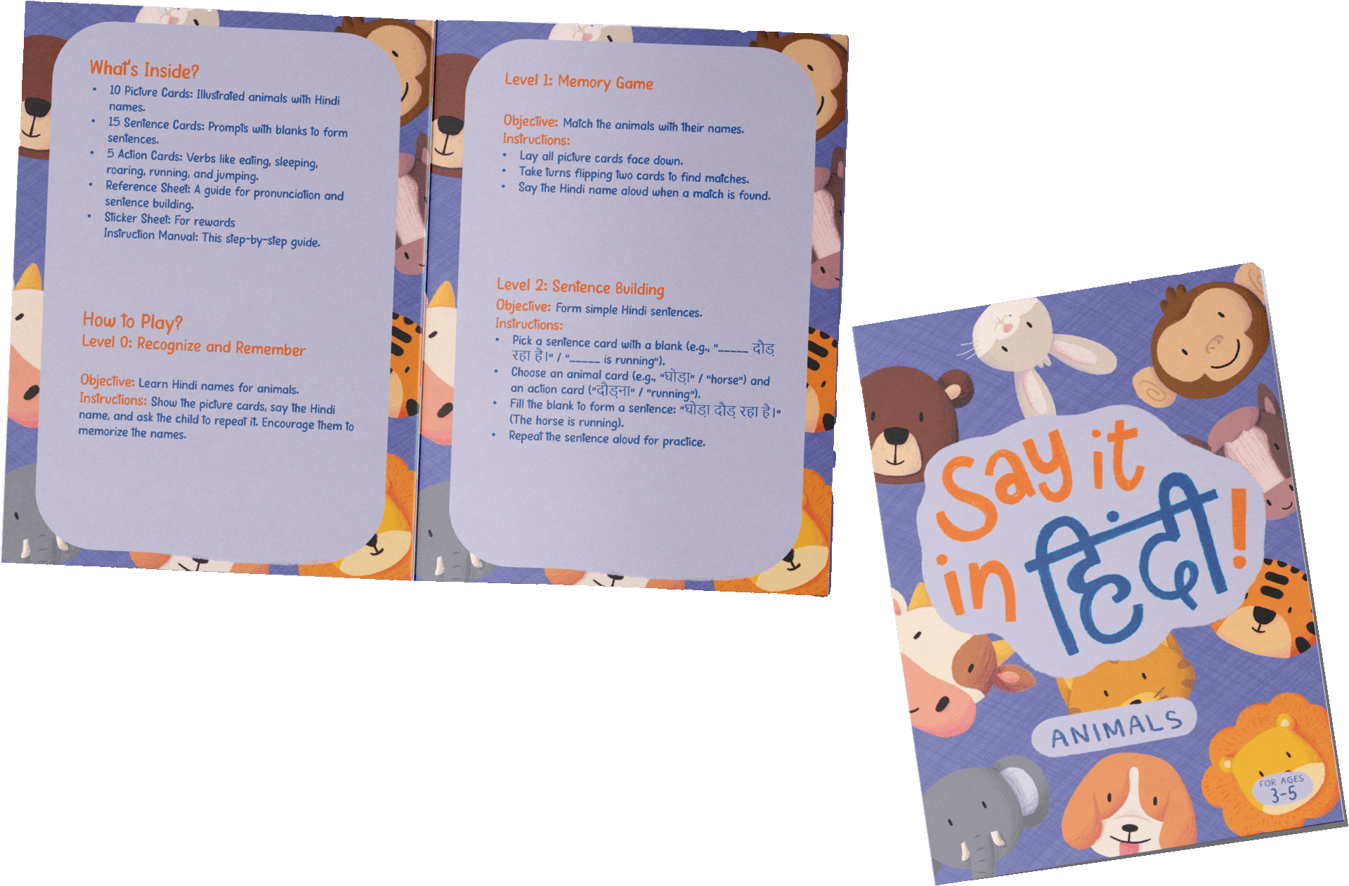 Say it in Hindi! is a modular flashcard game for children aged 3–5, designed to build basic Hindi vocabulary and sentence formation skills through play.