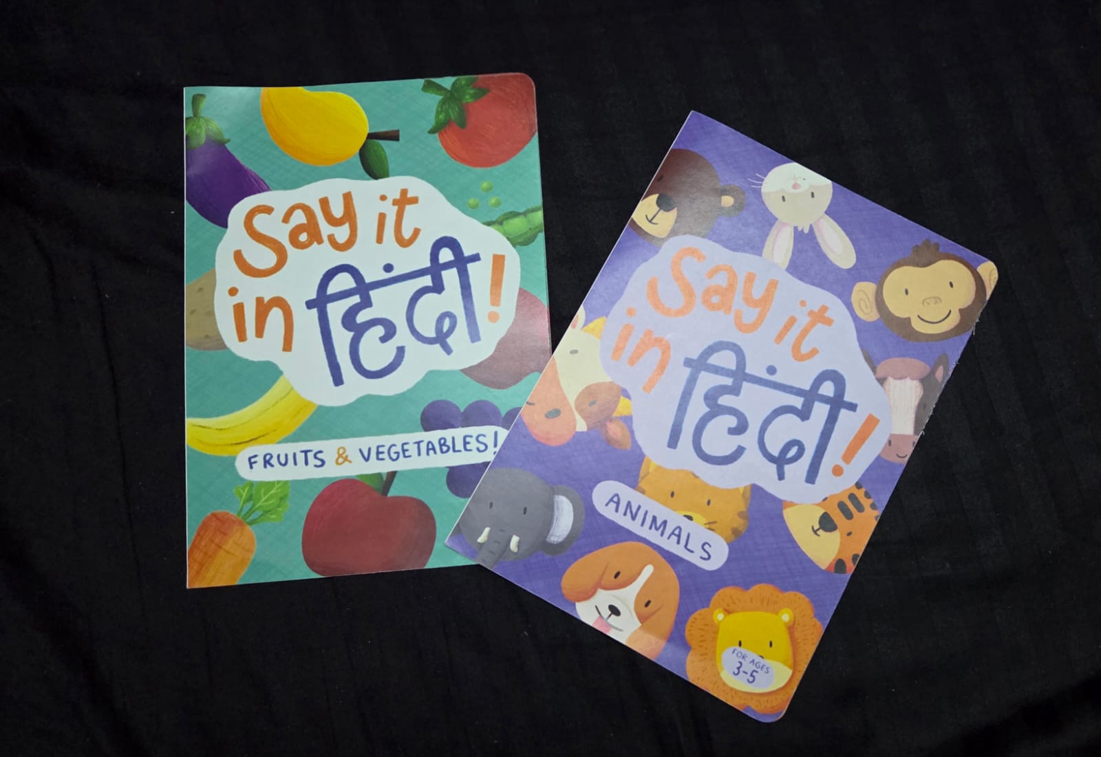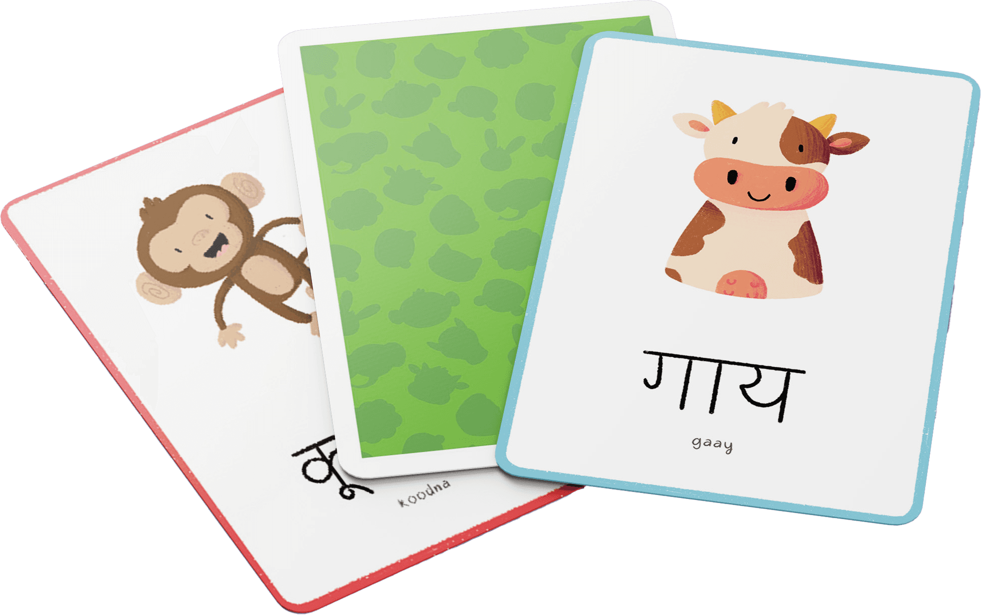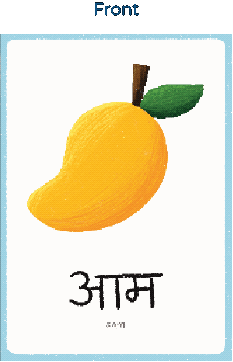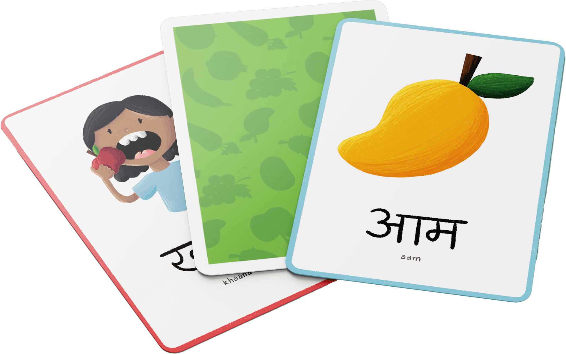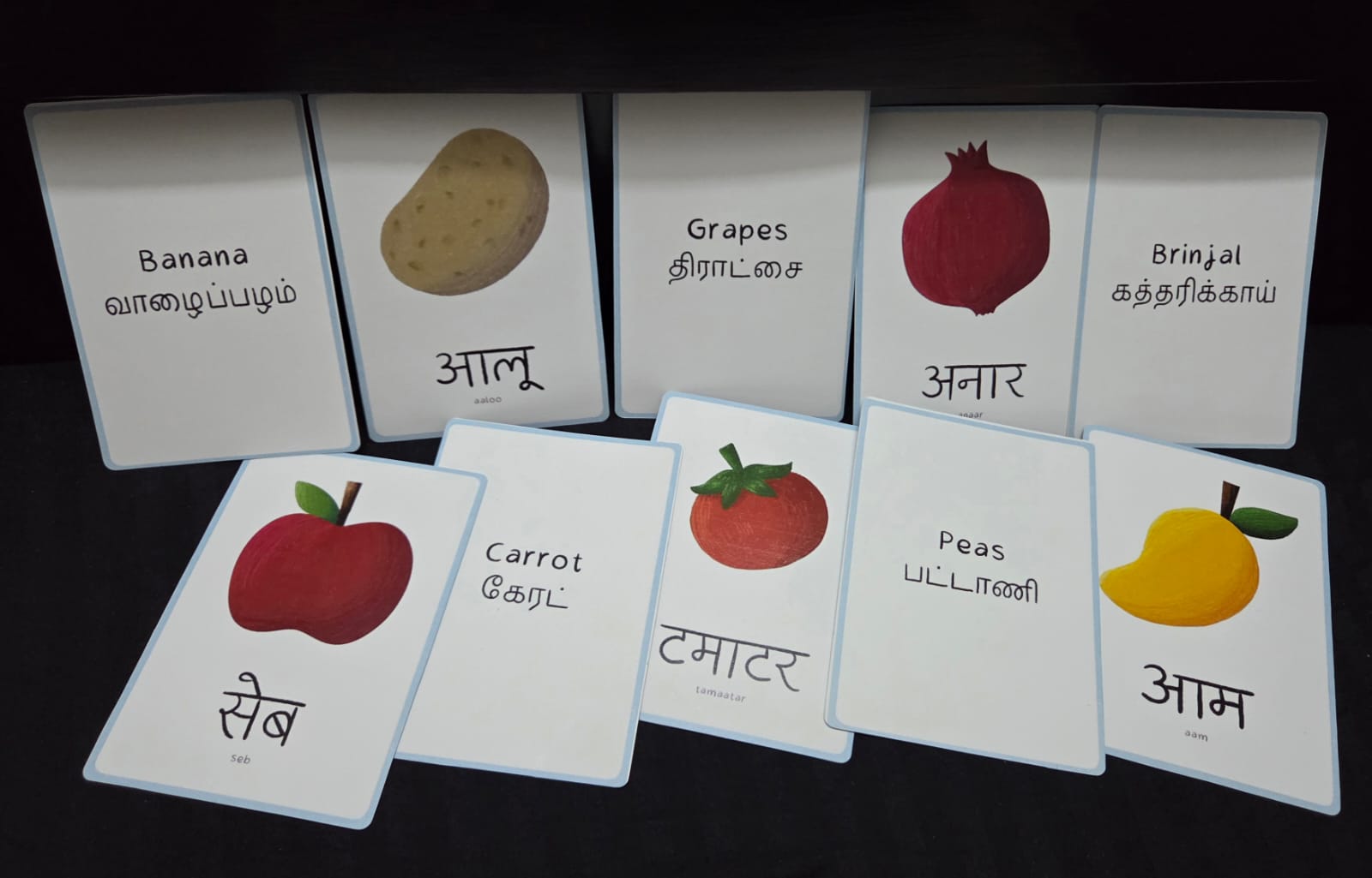 Goal: Familiarize the child with flashcards and reinforce recognition of fruits and vegetables or animals in Hindi.
