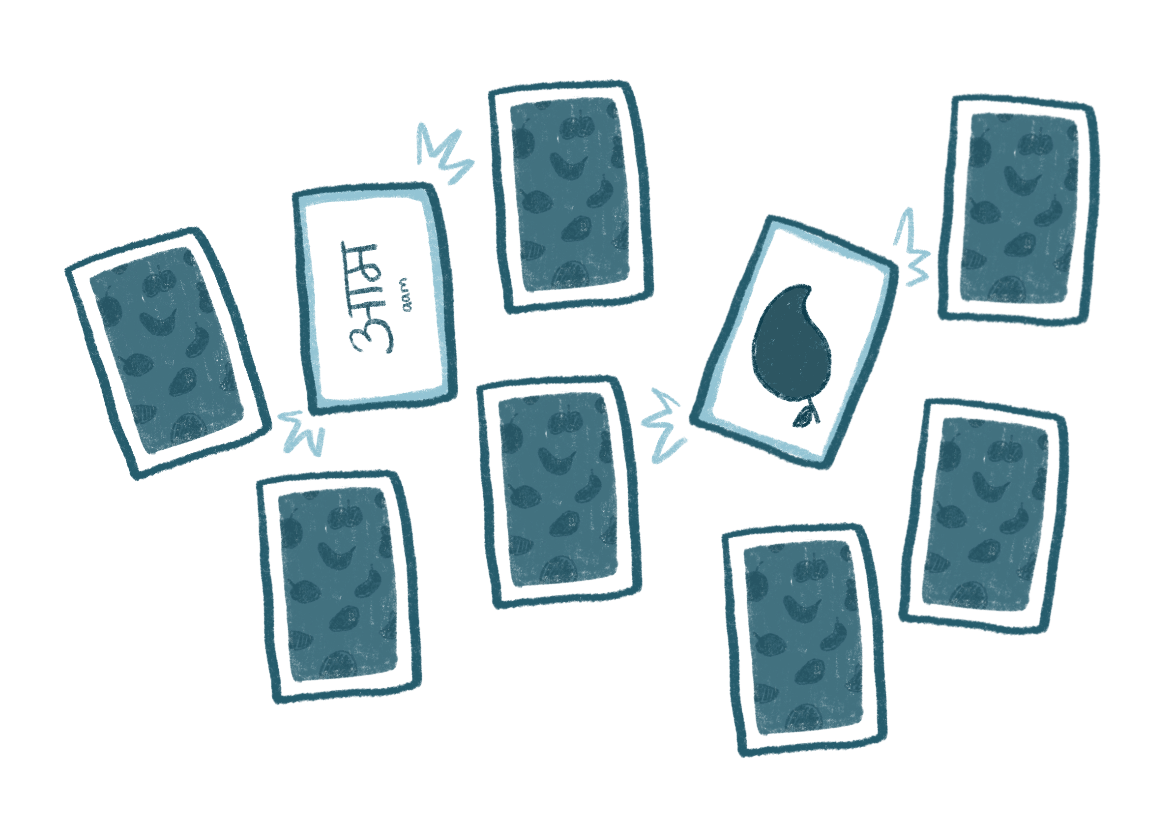 How to Play: Place all picture cards face down. Take turns flipping two cards at a time to find matching pairs. When a match is found, say the fruits & vegetables or animal’s Hindi name aloud together to reinforce learning.